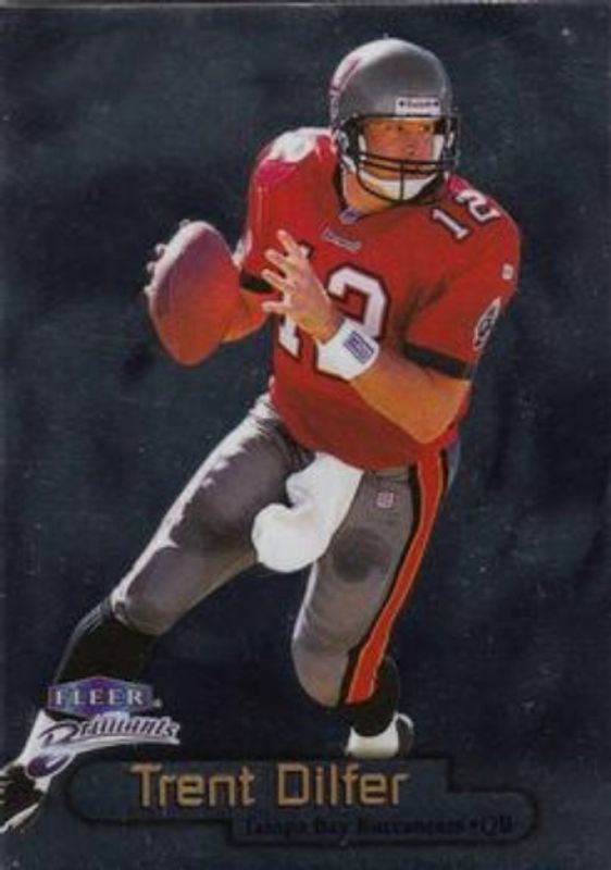 The Trent Dilfer 1998 Fleer Brilliants #12 Base card is 1 of 5 Trent Dilfer's card variations in the 1998 Fleer Brilliants set being tracked by Sports Card Investor, including #12B Blue, #12G Gold /99, #12TG Gold /99, and #12TG 24-Karat Gold /24.