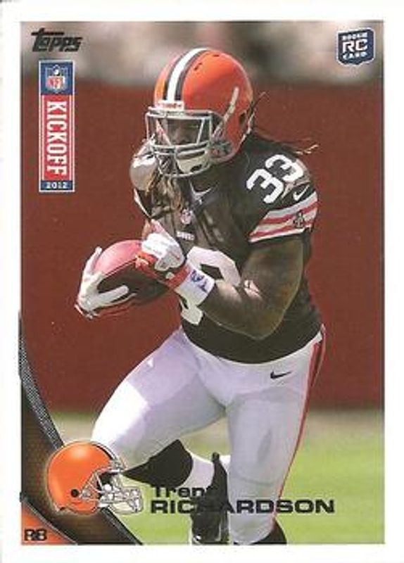 The Trent Richardson 2012 Topps Kickoff #8 Base Rookie card is 1 of 2 Trent Richardson's card variations in the 2012 Topps Kickoff set being tracked by Sports Card Investor, including Autographs /10.