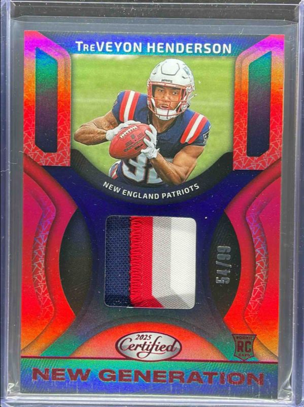 The TreVeyon Henderson 2025 Certified #NGJ-THN New Generation Jerseys Mirror - Mirror Red /99 Rookie card is 1 of 87 TreVeyon Henderson's card variations in the 2025 Certified set being tracked by Sports Card Investor, including Base Rookie /499, Mirror /399, Mirror Purple /299, Mirror Pink /225, and Mirror Orange /150.