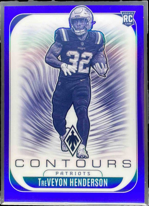 The TreVeyon Henderson 2025 Phoenix #22 Contours - Blue /199 Rookie card is 1 of 196 TreVeyon Henderson's card variations in the 2025 Phoenix set being tracked by Sports Card Investor, including Base, Silver, Silver Hyper, Silver Lava, and Silver Lazer.