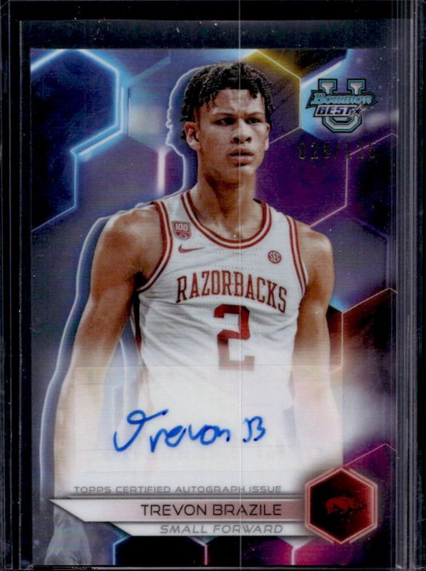 The Trevon Brazile 2023 Bowman Best University #B23-TB Best of 2023 Autographs - Refractor /125 card is 1 of 79 Trevon Brazile's card variations in the 2023 Bowman Best University set being tracked by Sports Card Investor, including Base, Refractor, Speckle Refractor, Blue Refractor /150, and Pink Lava Refractor /100.