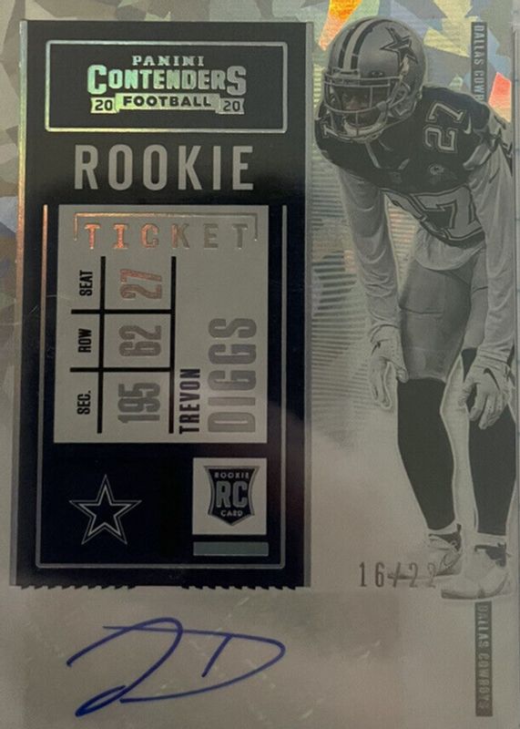 The Trevon Diggs 2020 Contenders #162 Rookie Ticket Auto - Cracked Ice Ticket /22 card in Raw condition has not changed in price in the last 30 days and was last sold for $165.50 .