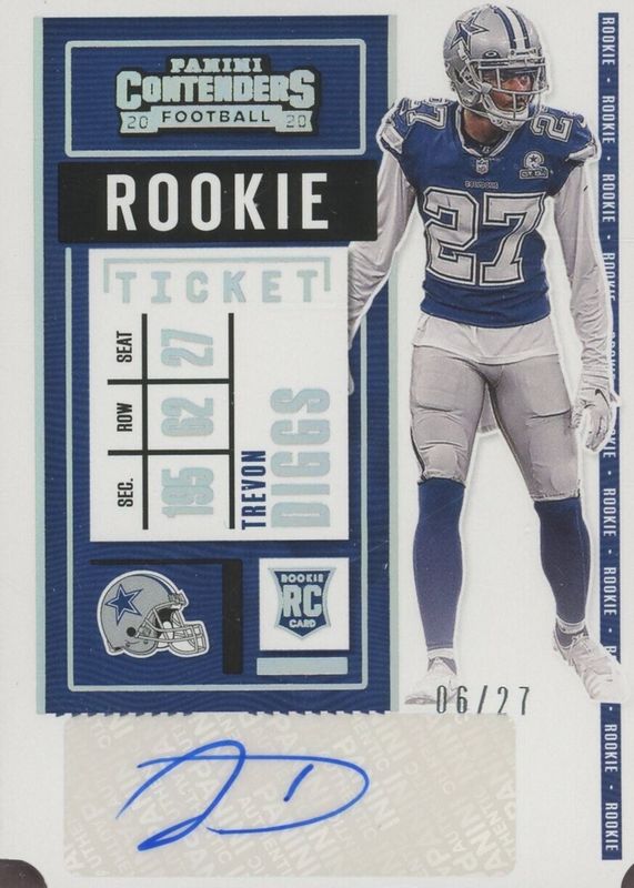 The Trevon Diggs 2020 Contenders #162 Rookie Ticket Auto Variation - Ticket Stub (/27) card in Raw condition has not changed in price in the last 30 days and was last sold for $37.00 .