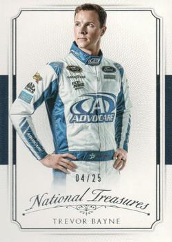 The Trevor Bayne 2016 National Treasures NASCAR #14 Base /25 card is 1 of 9 Trevor Bayne's card variations in the 2016 National Treasures NASCAR set being tracked by Sports Card Investor, including Century Silver /20, Century Gold /15, Century Black /5, Century Blue /1, and Printing Plates Black /1.