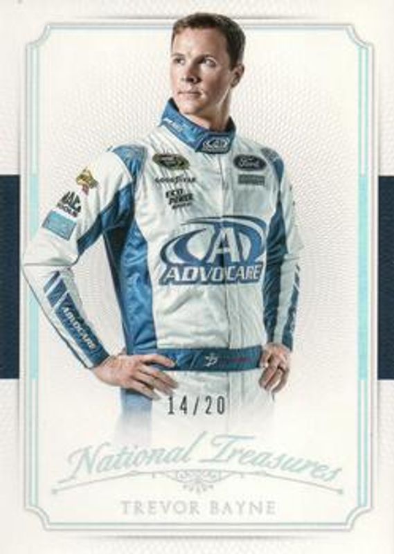 The Trevor Bayne 2016 National Treasures NASCAR #14 Century Silver /20 card is 1 of 9 Trevor Bayne's card variations in the 2016 National Treasures NASCAR set being tracked by Sports Card Investor, including Base /25, Century Gold /15, Century Black /5, Century Blue /1, and Printing Plates Black /1.