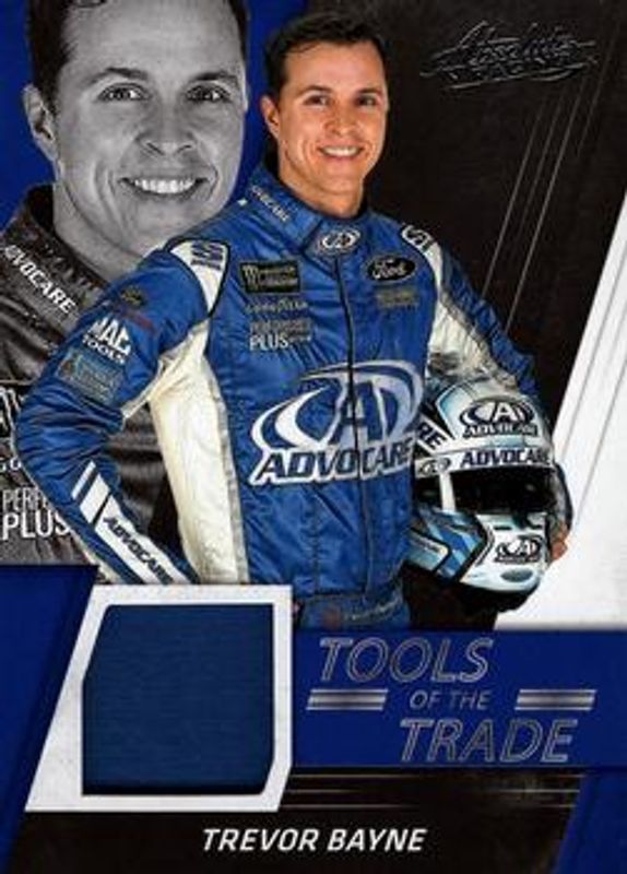The Trevor Bayne 2017 Absolute NASCAR #TT-TB Tools of the Trade card is 1 of 30 Trevor Bayne's card variations in the 2017 Absolute NASCAR set being tracked by Sports Card Investor, including Base, Spectrum Silver /299, Spectrum Blue /199, Spectrum Red /99, and Spectrum Gold /25.