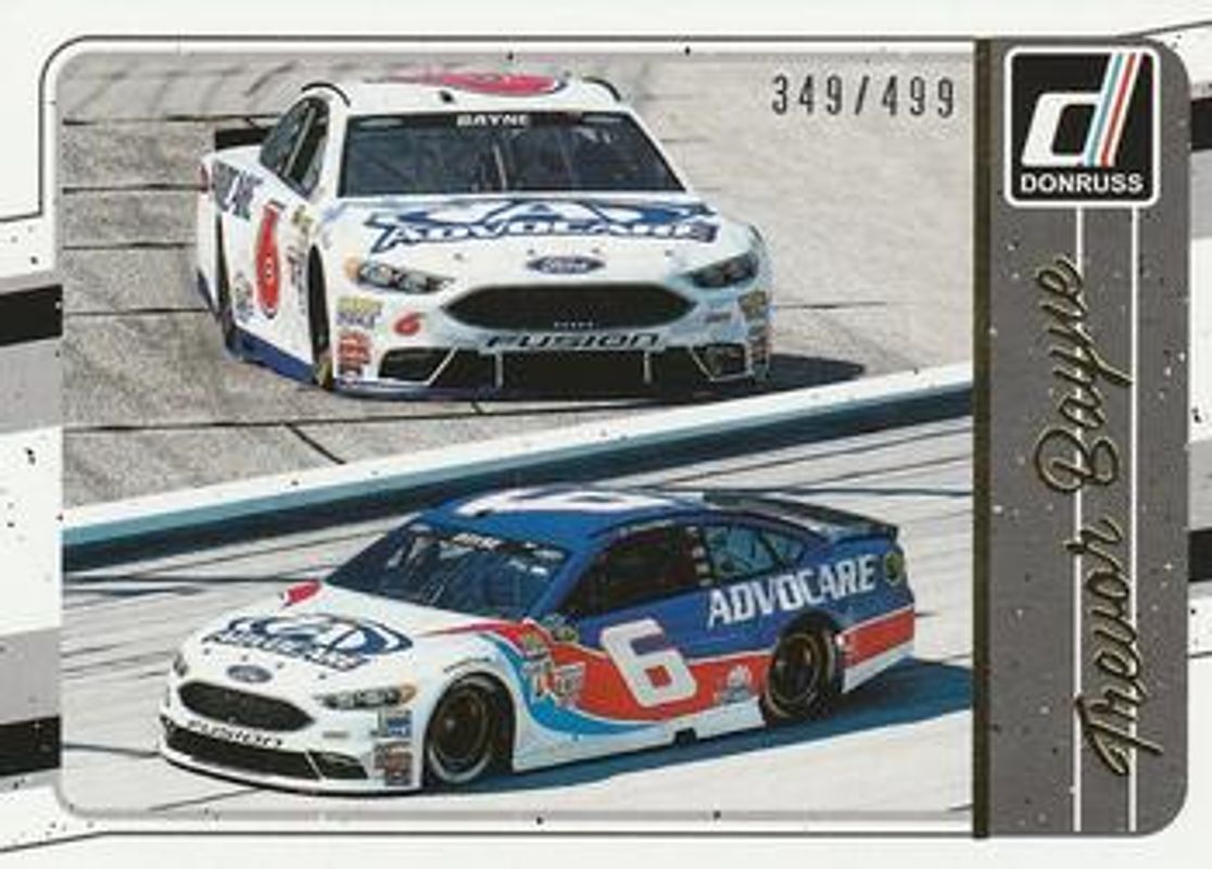 The Trevor Bayne 2017 Donruss NASCAR #108 Gold Foil /499 card is 1 of 41 Trevor Bayne's card variations in the 2017 Donruss NASCAR set being tracked by Sports Card Investor, including #54 Base, #108 Base, #18 Base, #54 Gold Foil /499, and #18 Gold Foil /499.
