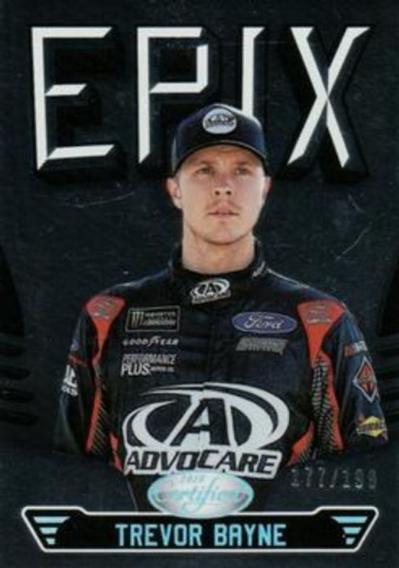 The Trevor Bayne 2018 Certified NASCAR #E14 Epix /199 card is 1 of 73 Trevor Bayne's card variations in the 2018 Certified NASCAR set being tracked by Sports Card Investor, including Base /149, Orange /249, Mirror Gold /25, Red /25, and Blue /20.