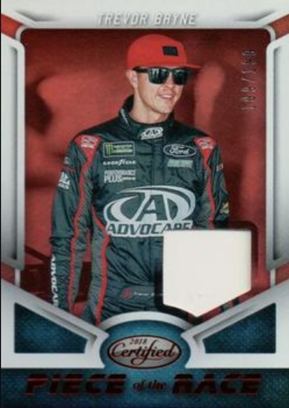 The Trevor Bayne 2018 Certified NASCAR #POTR-TB Piece of the Race Relics - Red /199 card is 1 of 73 Trevor Bayne's card variations in the 2018 Certified NASCAR set being tracked by Sports Card Investor, including Base /149, Orange /249, Mirror Gold /25, Red /25, and Blue /20.