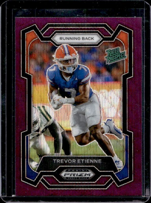 The Trevor Etienne 2024 Prizm Draft Picks #196 Purple Wave card is 1 of 43 Trevor Etienne's card variations in the 2024 Prizm Draft Picks set being tracked by Sports Card Investor, including Base, Green, Red Ice, Ruby Wave, and Silver.