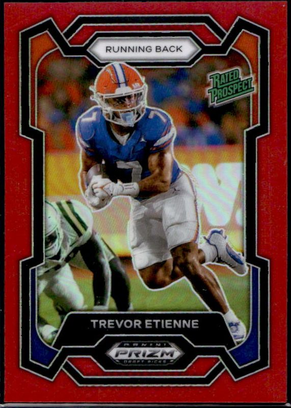 The Trevor Etienne 2024 Prizm Draft Picks #196 Red /299 card is 1 of 43 Trevor Etienne's card variations in the 2024 Prizm Draft Picks set being tracked by Sports Card Investor, including Base, Green, Purple Wave, Red Ice, and Ruby Wave.