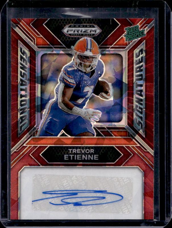 The Trevor Etienne 2024 Prizm Draft Picks #SS-TEE Sensational Signatures - Red Ice card is 1 of 43 Trevor Etienne's card variations in the 2024 Prizm Draft Picks set being tracked by Sports Card Investor, including Base, Green, Purple Wave, Red Ice, and Ruby Wave.