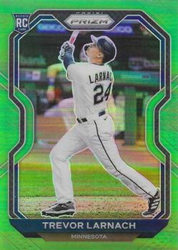 The Trevor Larnach 2021 Prizm #55 Lime Green /125 Rookie card is 1 of 43 Trevor Larnach's card variations in the 2021 Prizm set being tracked by Sports Card Investor, including Base, Blue, Blue Velocity, Carolina Blue, and Cosmic Haze.