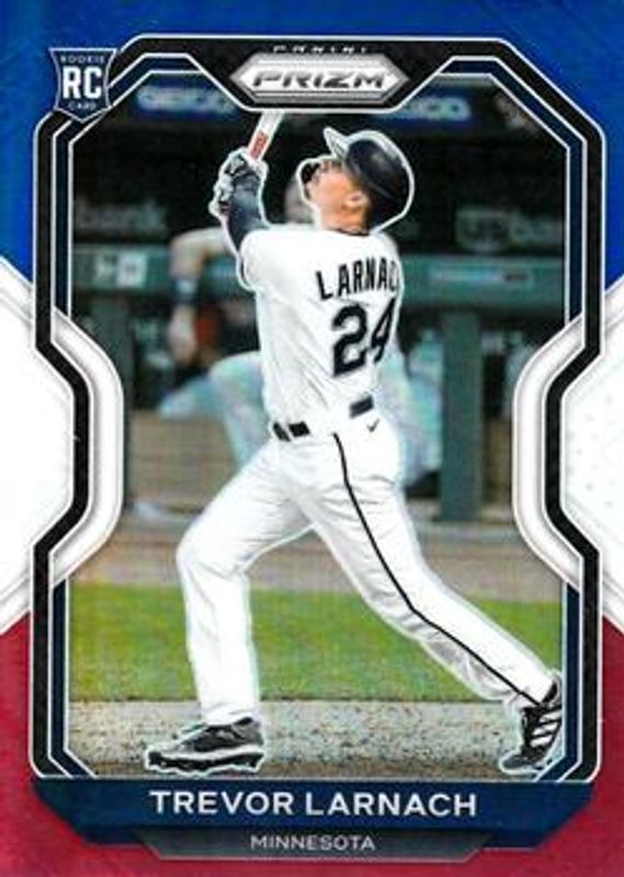The Trevor Larnach 2021 Prizm #55 Red White Blue Rookie card is 1 of 43 Trevor Larnach's card variations in the 2021 Prizm set being tracked by Sports Card Investor, including Base, Blue, Blue Velocity, Carolina Blue, and Cosmic Haze.