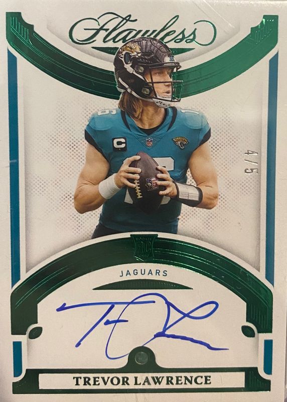 The Trevor Lawrence 2021 Flawless #RGS-TLA Rookie Gems Signatures - Emerald /5 card in Raw condition has not changed in price in the last 30 days and was last sold for $825.00 .