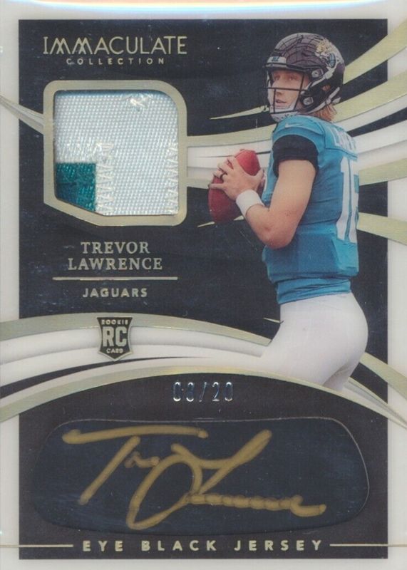 The Trevor Lawrence 2021 Immaculate #REB-TL Immaculate Rookie Eye Black Jersey Autographs - Gold (/20) card in Raw condition has not changed in price in the last 30 days and was last sold for $676.66 .