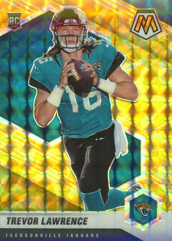The Trevor Lawrence 2021 Mosaic #301 Reactive Yellow Rookie card in Raw condition has moved up $9.97 (+248%) in the last 30 days and was last sold for $13.99 .