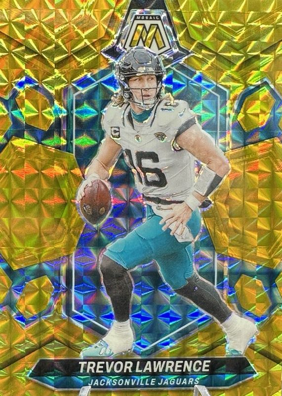 This card is 1 of 16 Trevor Lawrence's card variations in the 2024 Mosaic set being tracked by Sports Card Investor, including Choice Peacock /(SSP), Genesis /(SSP), Honeycomb /(SSP), Red Sparkle /(SSP), and White Sparkle /(SSP).