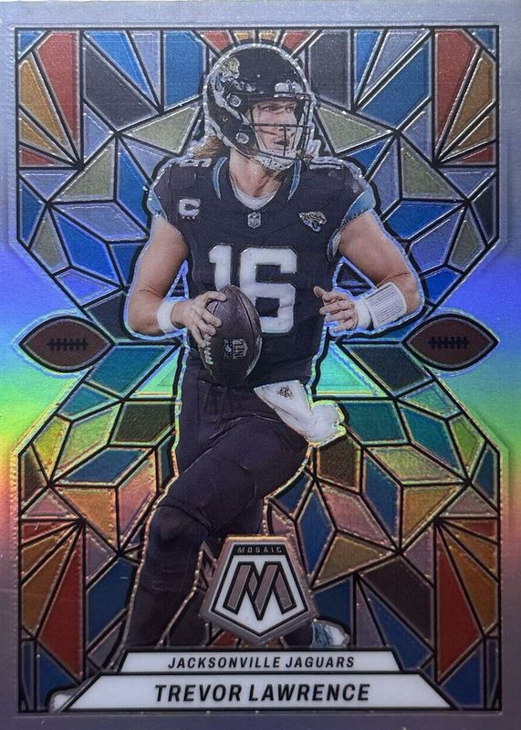 The Trevor Lawrence 2024 Mosaic #2 Stained Glass /(SSP) card in Raw condition has moved up $42.50 (+70.8%) in the last 30 days and was last sold for $102.50 .