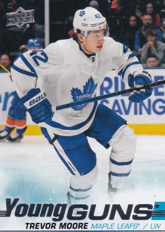 This card is 1 of 7 Trevor Moore's card variations in the 2019 Upper Deck set being tracked by Sports Card Investor, including Young Guns - Clear Cut, Young Guns - Clear Cut Exclusives, Young Guns - Silver Foil, Young Guns - Speckled Rainbow Foil, and Young Guns - UD Exclusives /100.