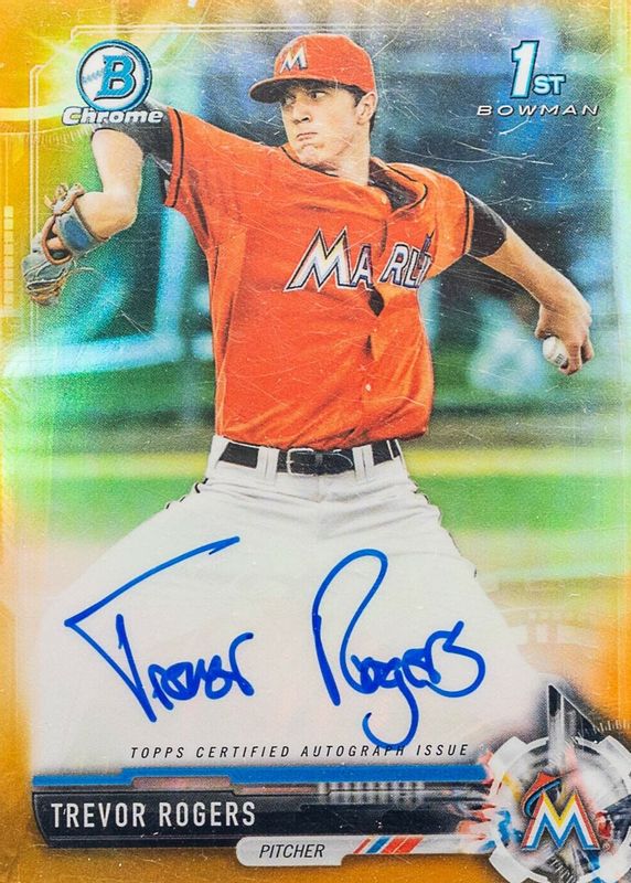 The Trevor Rogers 2017 Bowman Draft #CDA-TR Chrome DP Auto - Gold Refractor /50 (1st) card in Raw condition has not changed in price in the last 30 days and was last sold for $125.00 .