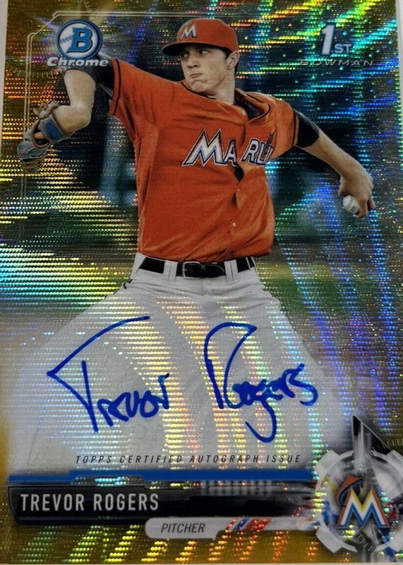 The Trevor Rogers 2017 Bowman Draft #CDA-TR Chrome DP Auto - Gold Wave Refractor /50 (1st) card in Raw condition has not changed in price in the last 30 days and was last sold for $14.00 .