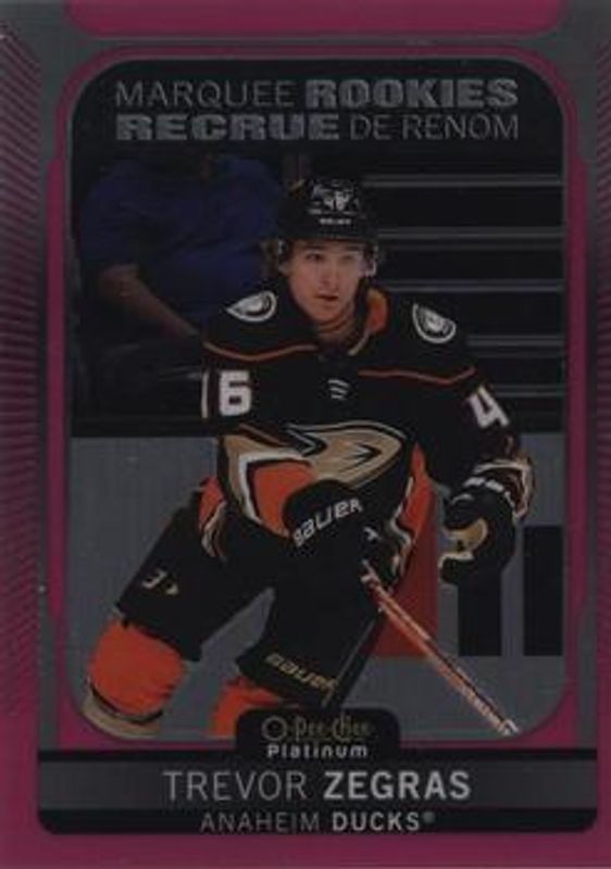 The Trevor Zegras 2021 O-Pee-Chee Platinum #203 Matte Pink Rookie card is 1 of 43 Trevor Zegras' card variations in the 2021 O-Pee-Chee Platinum set being tracked by Sports Card Investor, including Base, Black Shield (Marquee Rookies), Blue Surge, Neon Yellow Surge, and Rainbow.