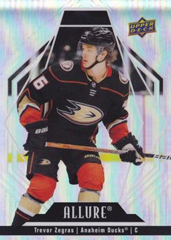 The Trevor Zegras 2022 Upper Deck Allure #60 Base card is 1 of 26 Trevor Zegras' card variations in the 2022 Upper Deck Allure set being tracked by Sports Card Investor, including Black Rainbow, Glitter Bomb, Orange Slice, Pink Leopard, and Red Rainbow.
