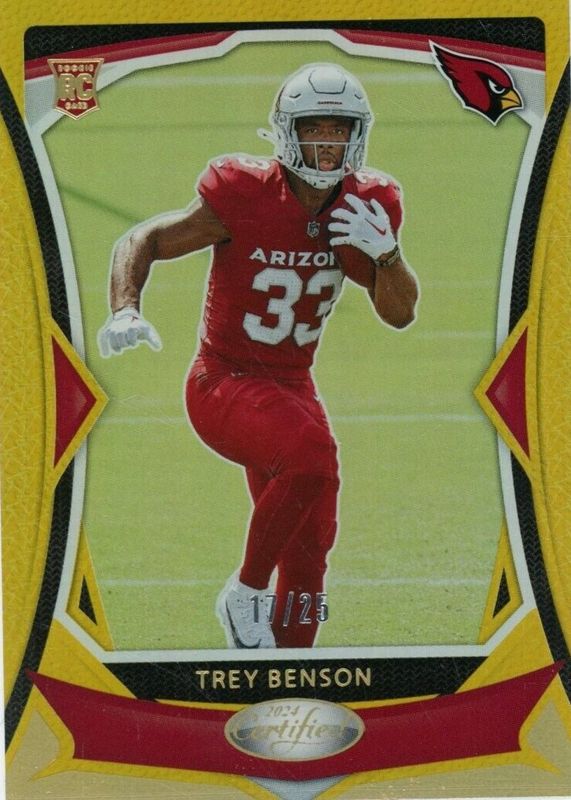 The Trey Benson 2024 Certified #151 Mirror Gold /25 Rookie card in Raw condition has not changed in price in the last 30 days and was last sold for $7.49 .