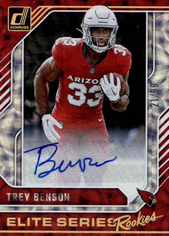 The Trey Benson 2024 Donruss #25 The Elite Series Rookies Autographs /99 card in Raw condition has not changed in price in the last 30 days and was last sold for $10.00 .
