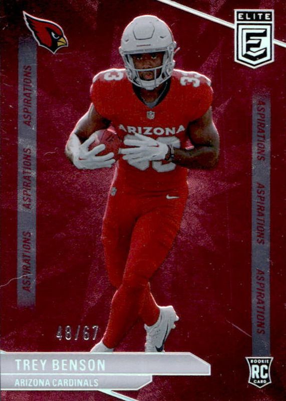 The Trey Benson 2024 Elite #124 Aspirations (/67) Rookie card in Raw condition has not changed in price in the last 30 days and was last sold for $1.00 .