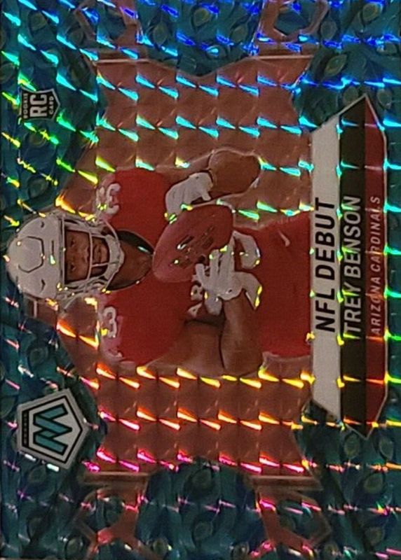 The Trey Benson 2024 Mosaic #277 NFL Debut - Choice Peacock /(SSP) Rookie card in Raw condition has not changed in price in the last 30 days and was last sold for $50.00 .