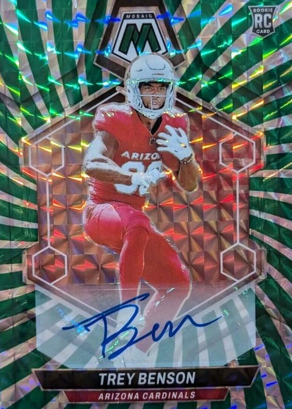 The Trey Benson 2024 Mosaic #360 Rookie Autographs - Green Swirl /15 card in Raw condition has not changed in price in the last 30 days and was last sold for $39.99 .