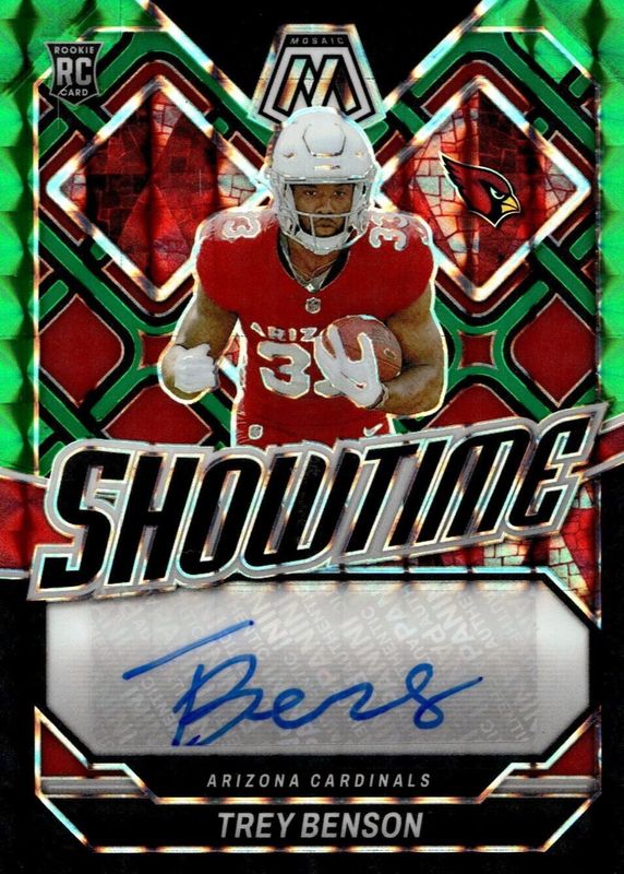 Trey Benson 2024 Mosaic #SS-TBN Showtime Signatures - Choice Fusion Green & Black /25 Rookie RAW Price Guide