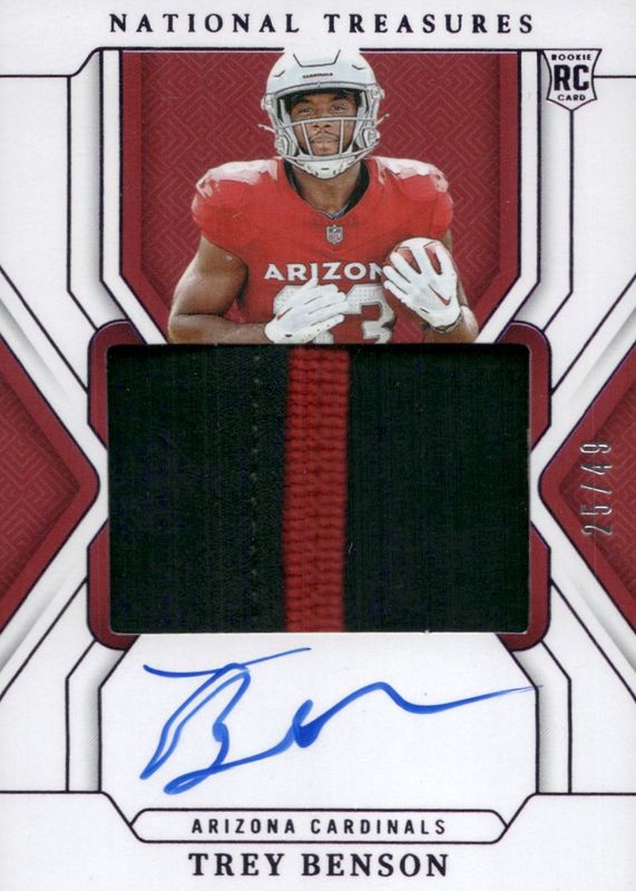 This card is 1 of 32 Trey Benson's card variations in the 2024 National Treasures set being tracked by Sports Card Investor, including Rookie Patch Auto - Green Jersey Number (/33), Rookie Patch Auto /99, Rookie Signatures Field Pass /99, Rookie Patch Auto - Premium /35, and Rookie Gloves Signatures /25.