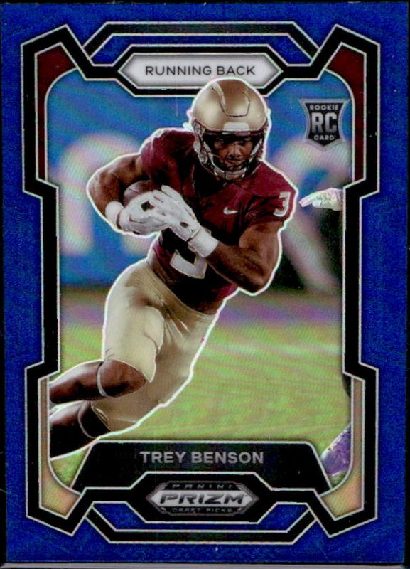 The Trey Benson 2024 Prizm Draft Picks #151 Blue /199 Rookie card is 1 of 161 Trey Benson's card variations in the 2024 Prizm Draft Picks set being tracked by Sports Card Investor, including Base, Green, Purple Wave, Red Ice, and Ruby Wave.