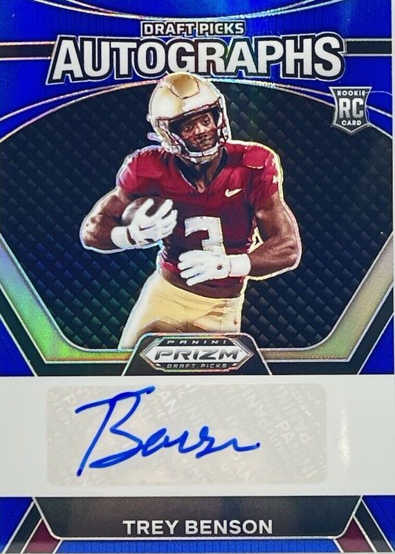 The Trey Benson 2024 Prizm Draft Picks #DPA-TBN Draft Picks Autographs - Blue /149 Rookie card in Raw condition has not changed in price in the last 30 days and was last sold for $6.99 .
