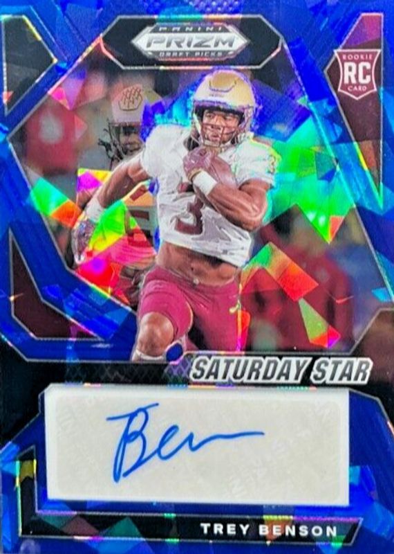 The Trey Benson 2024 Prizm Draft Picks #DPA-TBN Draft Picks Autographs - Blue Ice /75 Rookie card in Raw condition has not changed in price in the last 30 days and was last sold for $9.99 .