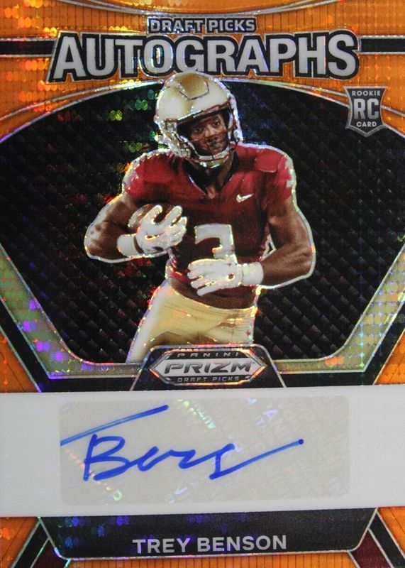 The Trey Benson 2024 Prizm Draft Picks #DPA-TBN Draft Picks Autographs - Orange Pulsar /49 Rookie card in Raw condition has not changed in price in the last 30 days and was last sold for $9.99 .