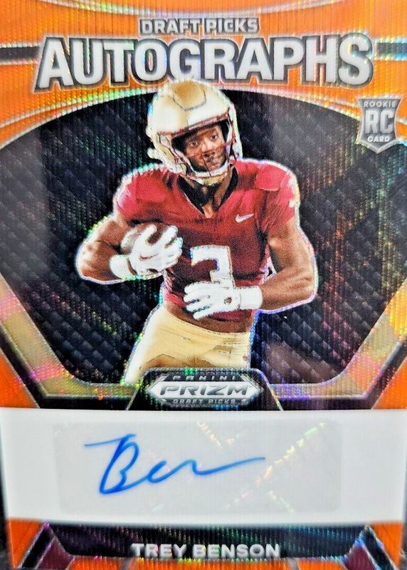 The Trey Benson 2024 Prizm Draft Picks #DPA-TBN Draft Picks Autographs - Orange Wave (/75) Rookie card in Raw condition has not changed in price in the last 30 days and was last sold for $10.00 .
