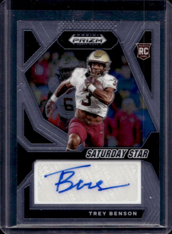 The Trey Benson 2024 Prizm Draft Picks #SSS-TBN Saturday Star Signatures Rookie card is 1 of 161 Trey Benson's card variations in the 2024 Prizm Draft Picks set being tracked by Sports Card Investor, including Base, Green, Purple Wave, Red Ice, and Ruby Wave.