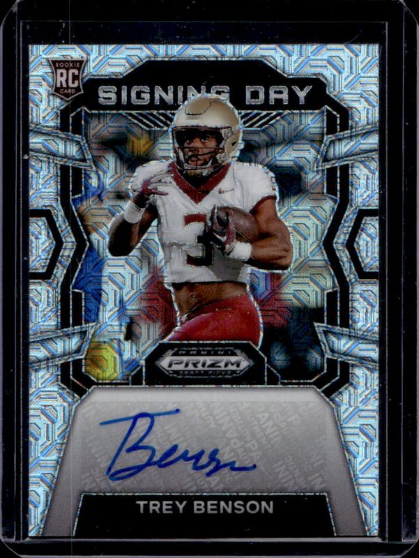 The Trey Benson 2024 Prizm Draft Picks #SD-TBN Signing Day Autographs - Mojo /25 Rookie card is 1 of 161 Trey Benson's card variations in the 2024 Prizm Draft Picks set being tracked by Sports Card Investor, including Base, Green, Purple Wave, Red Ice, and Ruby Wave.
