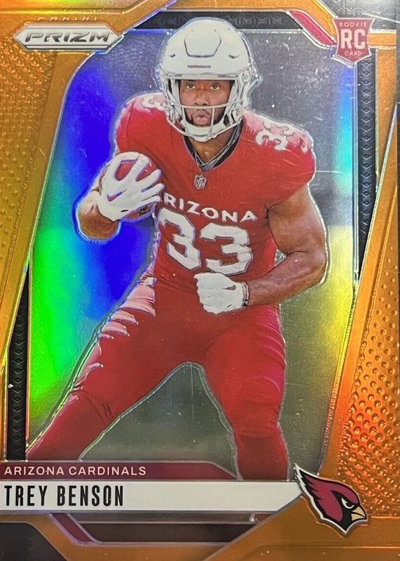 The Trey Benson 2024 Prizm #392 Orange /249 Rookie card in Raw condition has not changed in price in the last 30 days and was last sold for $4.00 .