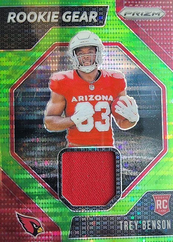 The Trey Benson 2024 Prizm #RG-TBN Rookie Gear - Neon Green Pulsar card in Raw condition has moved up $1.00 (+101%) in the last 30 days and was last sold for $1.99 .