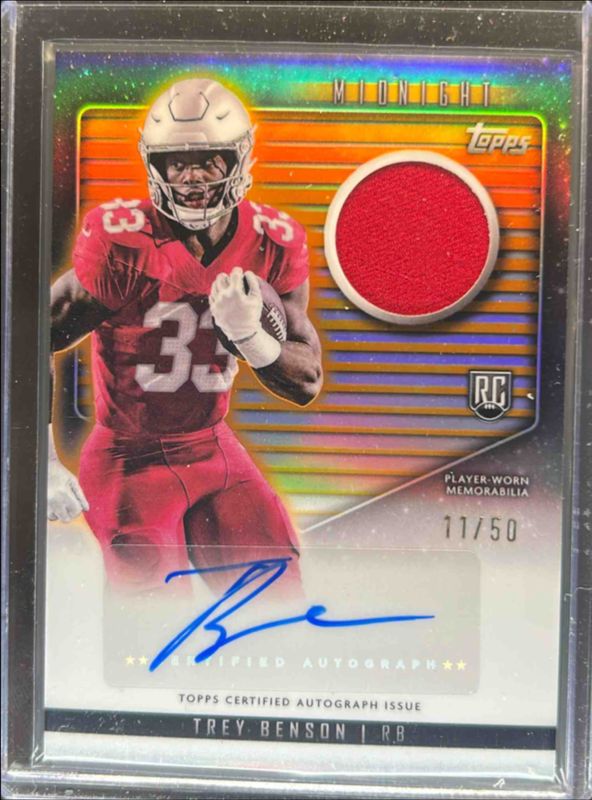 The Trey Benson 2024 Topps Midnight #RJA-TB Rookie Jersey Autographs - Summer Solstice /50 card is 1 of 55 Trey Benson's card variations in the 2024 Topps Midnight set being tracked by Sports Card Investor, including Base, Moon Beam, Zodiac, Morning /149, and Twilight /99.