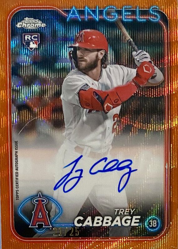 The Trey Cabbage 2024 Topps Chrome #RA-TCA Rookie Autographs - Orange Wave Refractor /25 card in Raw condition has not changed in price in the last 30 days and was last sold for $14.50 .