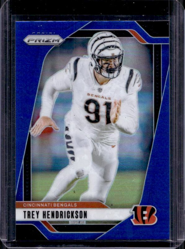 The Trey Hendrickson 2024 Prizm #59 Blue /(SSP) card is 1 of 84 Trey Hendrickson's card variations in the 2024 Prizm set being tracked by Sports Card Investor, including Base, Choice Blue Yellow Green, Choice Silver, Disco, and Green.