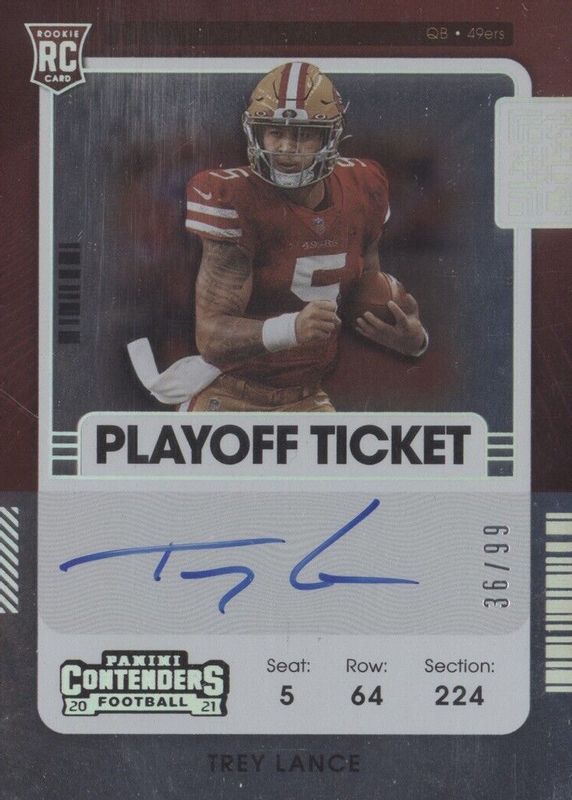 Trey Lance's Football cards are available in at least 47 sets. Trey Lance's biggest 7-day price movers are 2021 Prizm #333 Base, 2021 Prizm #333 Rookie Autographs - Silver, and 2021 Contenders #103 Rookie Ticket Auto - Playoff Ticket /99.