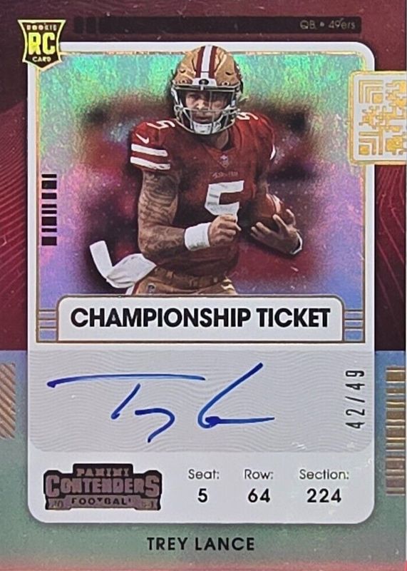 The Trey Lance 2021 Contenders #103 Rookie Ticket Auto - Championship Ticket /49 card in Raw condition has not changed in price in the last 30 days and was last sold for $212.50 .