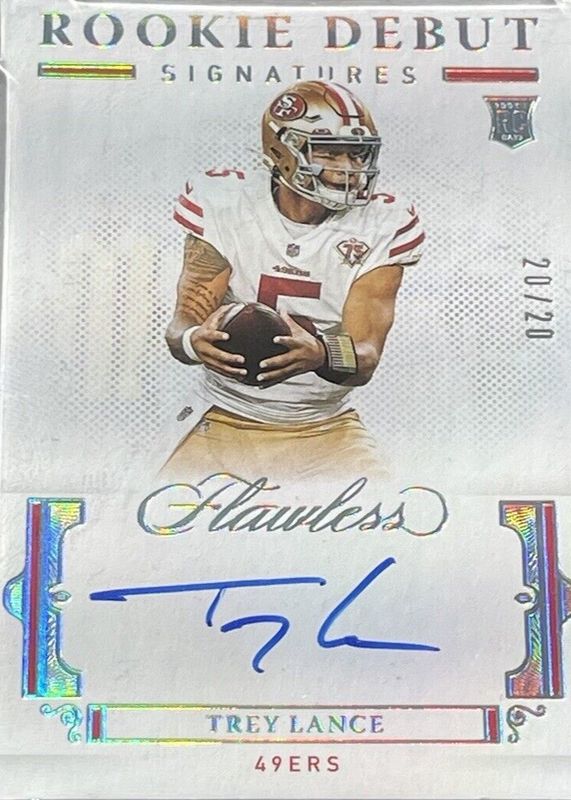 This card is 1 of 31 Trey Lance's card variations in the 2021 Flawless set being tracked by Sports Card Investor, including Flawless Rookie Signatures (/25), Flawless Rookie Signatures - Ruby (/15), Flawless Rookie Signatures - Sapphire (/10), Flawless Rookie Signatures - Silver (/20), and Rookie Debut Signatures (/25).